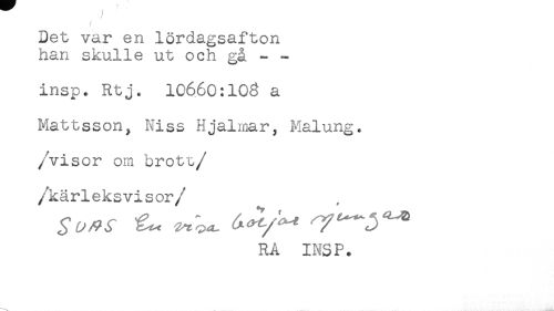 //// Det var en lördagsafton //// han skulle ut och gå - - //// insp. Rtj. 10660:108 a //// Mattsson, Niss Hjalmar, Malung, //// /visor om brotL //// //kärleksvisor //// /RA INSP. ////