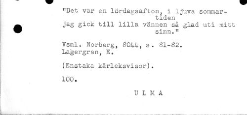 //// "Det var en lördagsafton, i ljuva sommar- //// tiden //// ^ jag gick till lilla vännen så glad uti mitt //// V sinn." //// Vsml. Norberg, 8044, s. 81-82. //// Lagergren, E. //// (Enstaka kärleksvisor). //// 100. //// \ //// U L M A ////