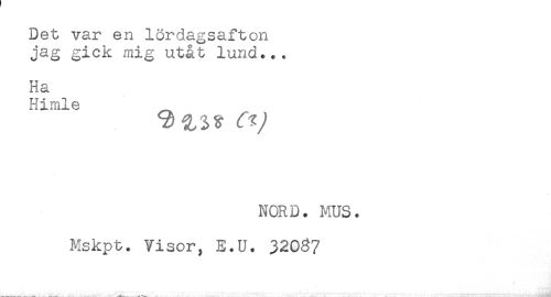 //// Det var en lördagsafton //// jag gick mig utåt lund... //// Ha //// Himle //// NORD. MUS. //// Mskpt. Visor, E.U. 32087 ////