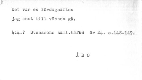 //// Det var en lördagsafton //// jag ment till vännen gå. //// i //// t //// 4:4*? Svenssons saml.häfM Nr 24. s.148-149. //// < //// i //// ! //// ! //// ÅBO ////