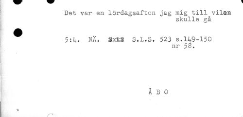//// Det var en lördagsafton jag mig till vilan //// skulle gå //// ^ 5:4. NÄ. SxLR S.L.S. 523 s.149-150 //// nr 58. //// - ////