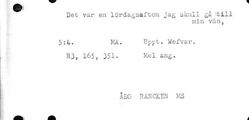 //// Det var en lördagsafton jag skull gå ttill //// min vän, //// . //// $:4. MA. Uppt. Wefvar. //// R3, 165, 351. Mel ang. //// ÅBO RANCKEN MS ////