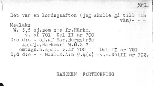 //// Det var en lördagsafton (jag skulle gå till min //// vän)---I //// Maalaks //// W. sj.som s:a fr.Härkm. //// v. af 701 Del II nr 700 //// D:o d:o - sj.af Mar.Bergström //// Lppfj.,Härkmari W.6.2 ? //// omtagn.n.spol. v.af 700 m Del ii nr 701 //// D;0 d:o - - Maal.E.A:n 9-4(x) -v.m.Délll nr 702. //// t //// RÅNCKEN FÖRTECKNING //// : //// ' //// t ////