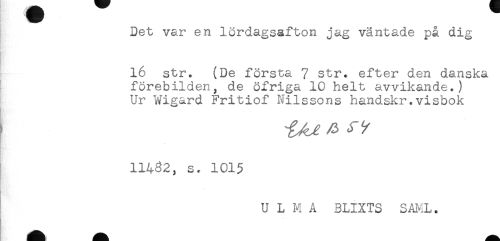 //// Det var en lördagsafton jag väntade på dig //// tH'.' //// 16 str. (De första 7 str. efter den danska //// förebilden, de öfriga 10 helt avvikande.) //// Ur Wigard Fritiof Nilssons handskr.visbok //// * //// 11482, s. 1015 //// U L M A BLIXTS SAML. ////