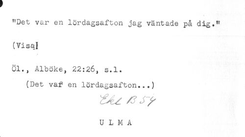 //// "Det var en lördagsafton jag väntade på dig." //// (Visai //// Öl., Alböke, 22:26, s.l. //// (Det vaf en lördagsafton..,) ////