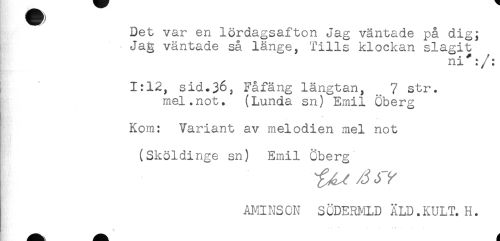 //// Det var en lördagsafton Jag väntade på dig; //// I - Jag väntade så länge, Tills klockan slagit //// ni*:/: //// j 1:12, sid.36, Fåfäng längtan, 7 str. //// mel.not. (Lunda sn) Emil Öberg //// .t //// Kom: Variant av melodien mel not //// (Sköldinge sn) Emil Öberg //// AMI NS ON S ÖDERMLD ÄLD. KULT. H. ////