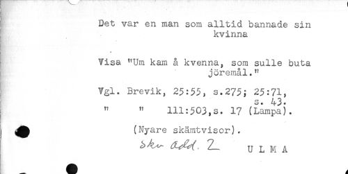 //// i Det var en man som alltid bannade sin //// j kvinna //// t //// I Visa "Um kam å kvenna, som sulle buta //// jöremål." //// I Vgl. Brevik, 25:55, s.275; 25:71, //// i s. 43' //// " ^ 111:503,s. 17 (Lampa). //// I ^^ (Nyare skämtvisor). //// ^^ ^^ u L M A ////