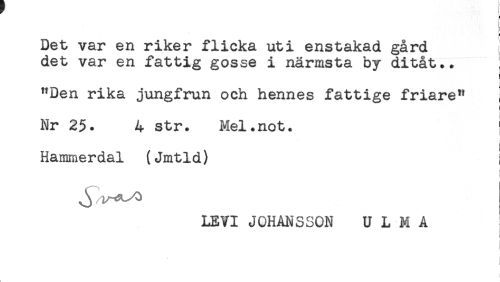 //// Det var en riker flicka uti enstakad gård //// det var en fattig gosse i närmsta by ditåt.* //// "Den rika jungfrun och hennes fattige friare" ; //// i //// Nr 2$. 4 str. Mel.not. ' //// Hammerdal (Jmtld) i //// ! //// LEVI JOHANSSON U L M A ////