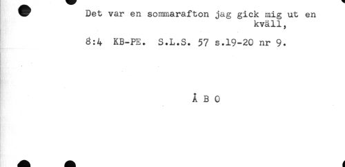 //// Det var en sommarafton jag gick mig ut en //// kväll, //// - * . . //// 3:4 KB-PE. S.L.S. 57 s.19-20 nr 9. //// * //// ÅBO ////