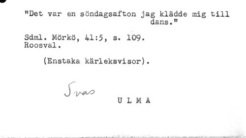 //// "Det var en söndagsafton jag klädde mig till //// dans." //// Sdml. Mörkö, 41:5, s. 109. //// Roosval. //// (Enstaka kärleksvisor). //// J) //// U L M A ////