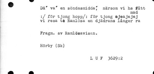 //// Dä* va* en söndasmidda* närsom vi ha fått //// mad //// :/ för tjong hopp/: för tjong ajeajejej //// vi resa te Ramlösa en djädrans långer ra //// * //// Fragm. av Ramlösavisan. //// Hörby (Sk) //// . //// L U F 3629:2 ////