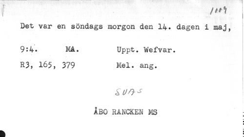 //// Det var en söndags morgon den 14. dagen i maj, //// 9:4. Må. Uppt. Wefvar. //// R3, 165, 379 Mel. ang. //// ! //// ÅBO RANCKEN MS ; //// H //// H ////
