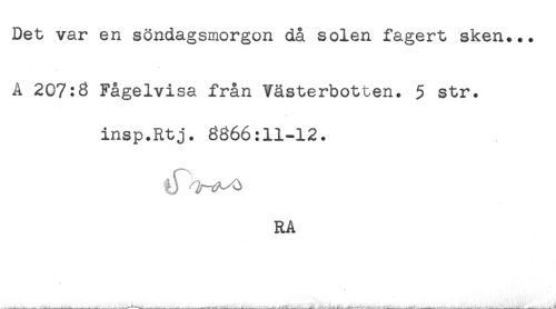 //// Det var en söndagsmorgon då solen fagert sken... //// A 207:8 Fågelvisa från Västerbotten. 5 str. //// insp.Rtj. 8866:11-12. //// RA ////
