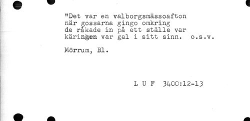 //// "Det var en valborgsmässoafton //// när gossarna gingo omkring //// de råkade in på ett ställe var //// käringen var gal i sitt sinn. o.s.v. //// Mörrum, Bl. //// L U F 3400:12-13 ////