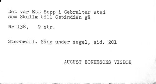 //// Det var Ett Sepp i Gebraltar stad //// som Skulls: till Ostindien gå //// Nr 136, 9 str. //// Stemwall. Sång under segel, sid. 201 //// AUGUST BONDESONS VISBOK ////