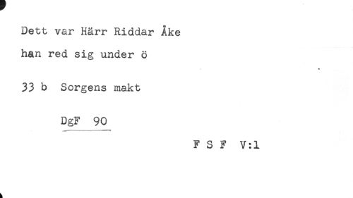 //// Dett var Härr Riddar Åke //// han red sig under ö //// 33 b Sorgens makt //// DgF 90 //// F S F V:1 ////