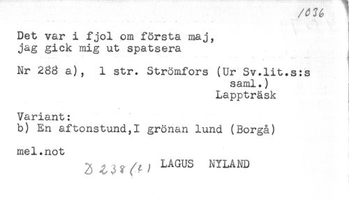 //// /PJ6 //// ^ -- ' ... - ... .. - *' //// Det var i fjol om första maj, //// jag gick mig ut spatsera //// - -- ' - . i //// Nr 233 a), 1 str. Strömfors (Ur Sv.lit.s:s //// s aml.) //// Lappträsk //// Variant: //// b) En aftonstund,I grönan lund (Borgå) //// mel.not //// 3 ? < / LA^S NYLAND ////
