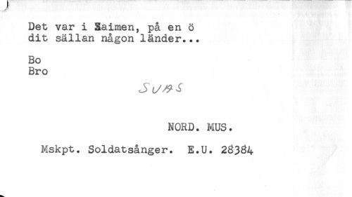 //// Det var i Saimen, på en ö //// dit sällan någon länder... //// Bo //// Bro //// NORD. MUS. //// Mskpt. Soldatsånger. E.U. 28384 ////