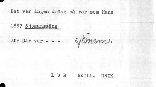 //// Det var ingen dräng så rar som Hans //// * - ' , //// 166? Sjömanssång //// Jfr Där var--- //// L U B SKILL. UNIK ////