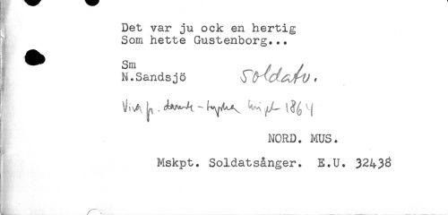 //// Det var ju ock en hertig //// Som hette Gustenborg... //// ^Sandsjö . //// NORD. MUS. //// Mskpt. Soldatsånger. E.U. 32438 ////