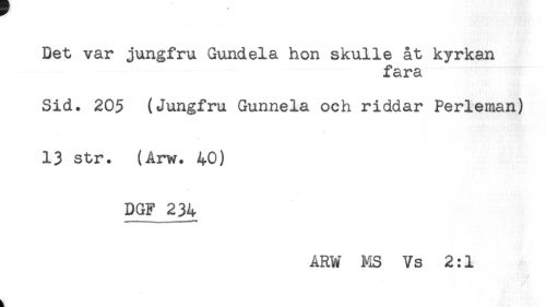 //// Det var jungfru Gundela hon skulle åt kyrkan //// fara //// Sid. 205 (Jungfru Gunnela och riddar Perleman) //// 13 str. (Arw. 40) //// DGF 234 //// ARW MS Vs 2:1 ////