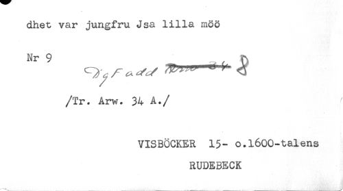 //// dhet var jungfru Jsa lilla möö //// Nr 9 __ ^ //// /-,, v/ ' ^^ <3 //// /Tr. Arw. 34 A. //// /VISBÖCKER 15- o.l600-talens //// RUDEBECK //// _ _ _ _ _ _ _ ////