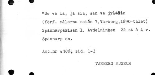 //// "De va la, ja sia, san ve jylä&in //// (förf. målarna natén ?,Varberg,l890-talet) //// Spannarpavisan 1. Avdelningen 22 st å 4 v. //// Spannarp sn. //// Acc + nr 4366^. sid. 1-3 ////