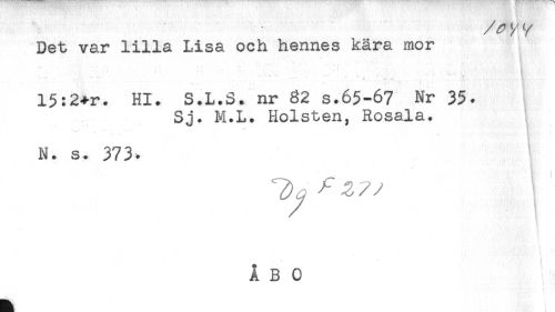 //// Det var lilla Lisa och hennes kära mor //// 'ås-*' ** //// < ..... //// 15:2+r. Hl. S.L.S. nr 82 s.65-67 Nr 35. //// Sj. M.L. Holsten, Rosala. //// N. s. 373, //// Ty - //// . s ////