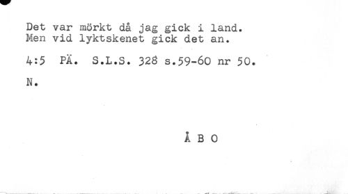 //// Det var mörkt då jag gick i land. //// Men vid lyktskenet gick det an. //// 4:5 PÄ. S.L.S. 323 s.59-60 nr 50. //// N. //// ÅBO //// *< ////