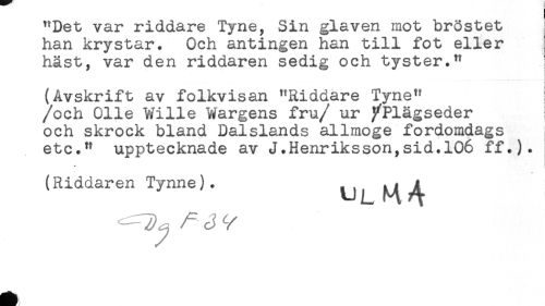 //// "Det var riddare Tyne, Sin glaven mot bröstet //// han krystar. Och antingen han till fot eller //// häst, var den riddaren sedig och tyster." i //// (Avskrift av folkvisan "Riddare Tyne" ! //// /och Olle Wille Wargens fru/ ur /Plägseder //// och skrock bland Dalslands allmoge fordomdags ^ //// etc." upptecknade av J.Henriksson,sid.106 ff.). //// 4 //// (Riddaren Tynne). f^A //// ^ j ////