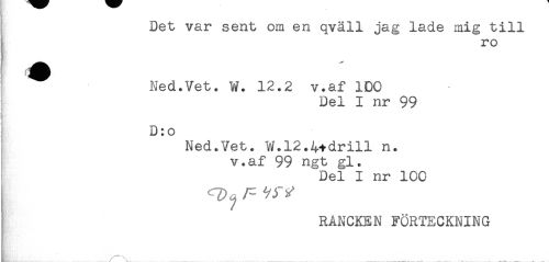 //// I Det var sent om en qväll jag lade mig till //// !j ro //// Ned.Vet. W. 12.2 v.af 100 //// Del I nr 99 //// n //// t' //// D:o //// Ned.Vet. W.12.4+drill n. //// v.af 99 ngt gl. //// Del I nr 100 //// RANCKEN FÖRTECKNING //// ....... .....-.... .....^....._.....^....... ////