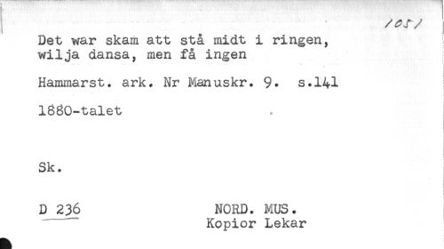 //// I ' /^J^/ I //// Det war skam att stå midt i ringen, ! //// wilja dansa, men få ingen //// Hammarst. ark. Nr Manuskr. 9* s.141 //// . .. / * i //// 1880-talet //// Sk. //// i //// ! //// D 2% NORD. MUS. //// Kopior Lekar ////