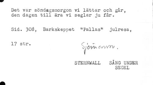 //// Det var söndagsmorgon vi lättar och går, //// den dagen till ära vi seglar ju får. ! //// < //// < //// Sid. 308, Barkskeppet "Pallas" julresa, //// 17 str. (t - _ //// STERNWALL SÅNG UNDER //// SEGEL ////