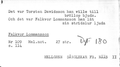 //// Det var Torsten Davidsson han ville till ! //// bröllop bjuda. //// Och det var Falkvor Lommansson han lät ! //// sin stridslur ljuda //// Falkvor Lommansson //// Nr 109 Mel.not. 27 str. //// s. 114 ' //// i //// HELLGREN SÅNGLEKAR FR. NAAS II j //// ! //// j ////