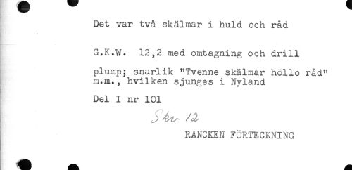 //// Det var två skälmar i huld och råd //// * //// G.K.W. 12,2 med omtagning och drill //// plump; snarlik "Tvenne skälmar höllo råd" //// m.m., hvilken sjunges i Nyland //// Del I nr 101 //// RANCKEN FÖRTECKNING ////