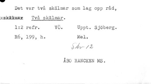 //// Det var två skälmar som lag opp råd, //// xskä±mXK Två skälmar. //// 1:2 refr. VÖ. Uppt. Sjöberg. //// R6, 199, h. Mel. //// j ^ / Z //// ÅBO RANCKEN MS. //// -- ////