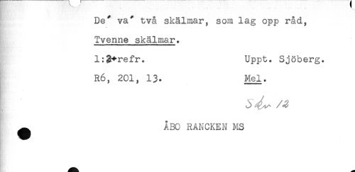 //// ^ ' . . //// De^ va^ två skälmar, som lag opp råd, //// Tvenne skälmar. //// l:2+refr. Uppt. Sjöberg. //// R6, 201, 13. Mel. //// ^ ABC RANCKEN MS ////