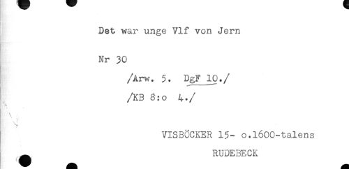 //// Det war unge Vif von Jern //// Nr 30 //// /Arw. 5. DgF 10. //// //KB o 4. //// /\ //// \ - //// VISBOCKER 1$- o.l600-talens //// ^ RUDEBECK ////