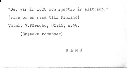 //// "Det var år 1800 och sjuttio år alltjämt." //// (visa om en resa till Finland) //// Vstml. V.Färnebo, 90:46, s.59. //// (Enstaka romanser) //// U L M A ////