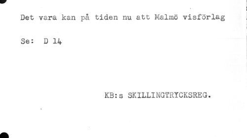 //// ! //// : //// Det vara kan på tiden nu att Malmö visförlag //// t //// Se: D 14 //// i //// KB:s SKILLINGTRYCKSREG. //// T ////