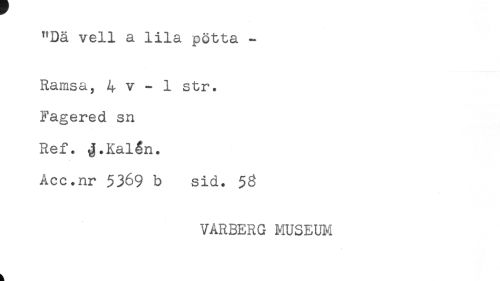 //// "Dä vell a lila pötta - //// Ramsa, 4 v - 1 str. //// Fagered sn //// Ref. j.Kalån. //// Acc.nr $369 b sid. 58 //// VÅRBERG MUSEUM //// k ////