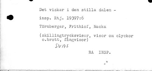 //// Det viskar i den stilla dalen - //// insp. Rtj. 19397:6 //// i //// Törnberger, Frithiof, Nacka //// < . . //// (skillingtrycksvisor^ visor om olyckor //// o.brott, fångvisor) //// RA INSP. //// ) ^ //// # ////