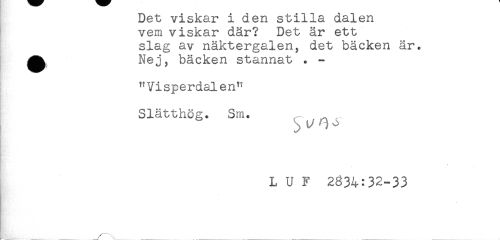 //// Det viskar i den stilla dalen //// vem viskar där? Det är ett //// slag av näktergalen, det bäcken är. //// ^ Nej? bäcken stannat . - //// "Visperdalen" //// Slätthög. Sm. //// L U F 2834:32-33 ////