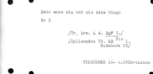 //// Dett wore siu och siu sine tiugo //// Nr 5 //// /Tr. Arw. 4 A. DgF_7_. //// //Gyllenmärs 79. KB 1. //// Rudebeck 29 //// /VISBÖCKER 15- o.l600-talens ////