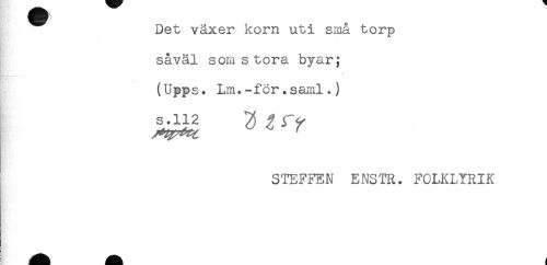 //// Det växer korn uti små torp //// såväl som s tora byar; //// ' . ! //// (Upps. Lm.-för.saml.) //// S'ij-2 3 ^ //// STEFFEN ENSTR. FOLKLYRIK ////