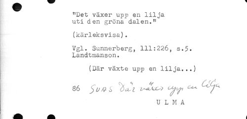 //// "Det växer upp en lilja //// uti den gröna dalen." //// (kärleksvisa). //// Vgl. Sunnerberg, 111:226, s.5* //// Landtmanson. //// (Där växte upp en lilja...) //// U L M A ////