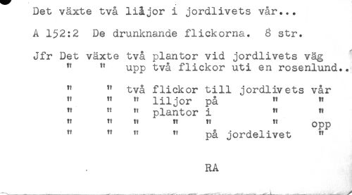 //// ueu vaxue uva j- var... //// A 152:2 De drunknande flickorna. 6 str. //// Jfr Det växte två plantor vid jordlivets väg //// " " upp två flickor uti en rosenlund.. //// " " två flickor till jordlivets vår //// " " " liljor på " " //// tt " " plantor i " " //// tt t! tt t! ty H Qpp //// " ^ " " på jordelivet " //// RA ////