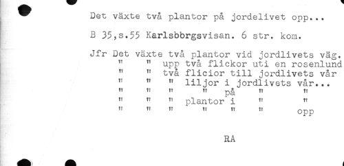 //// ^ Det växte två plantor på jordelivet opp... //// B 35,s.55 Karlsbbrgsvisan. 6 str. kom. //// Jfr Det växte två plantor vid jordlivets väg. //// " " upp två flickor uti en rosenlund //// " " två flicior till jordlivets vår //// ' " " liljor i jordlivets vår... //// It T! t? T? p^ TT tt //// " t! tt plantor^ i " " //// t? t! TT T^ TT TT Opp //// - //// //// /