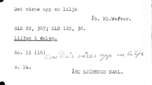//// Det växte upp en lilja //// Åb. Nl.Wefvar. //// SLS 62, 367; SLS 125, 33* //// Lilian i dalen. //// No. 15 (16) * .. //// S. 14. ////