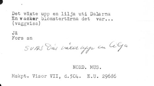//// Det växte upp en lilja uti Dalarna //// En vacker blomstertärna det var... //// (vaggvisa) //// Jä //// Fors sn //// NORD. MUS. //// Mskpt. Visor VII, d.504* E.U. 29686 ////